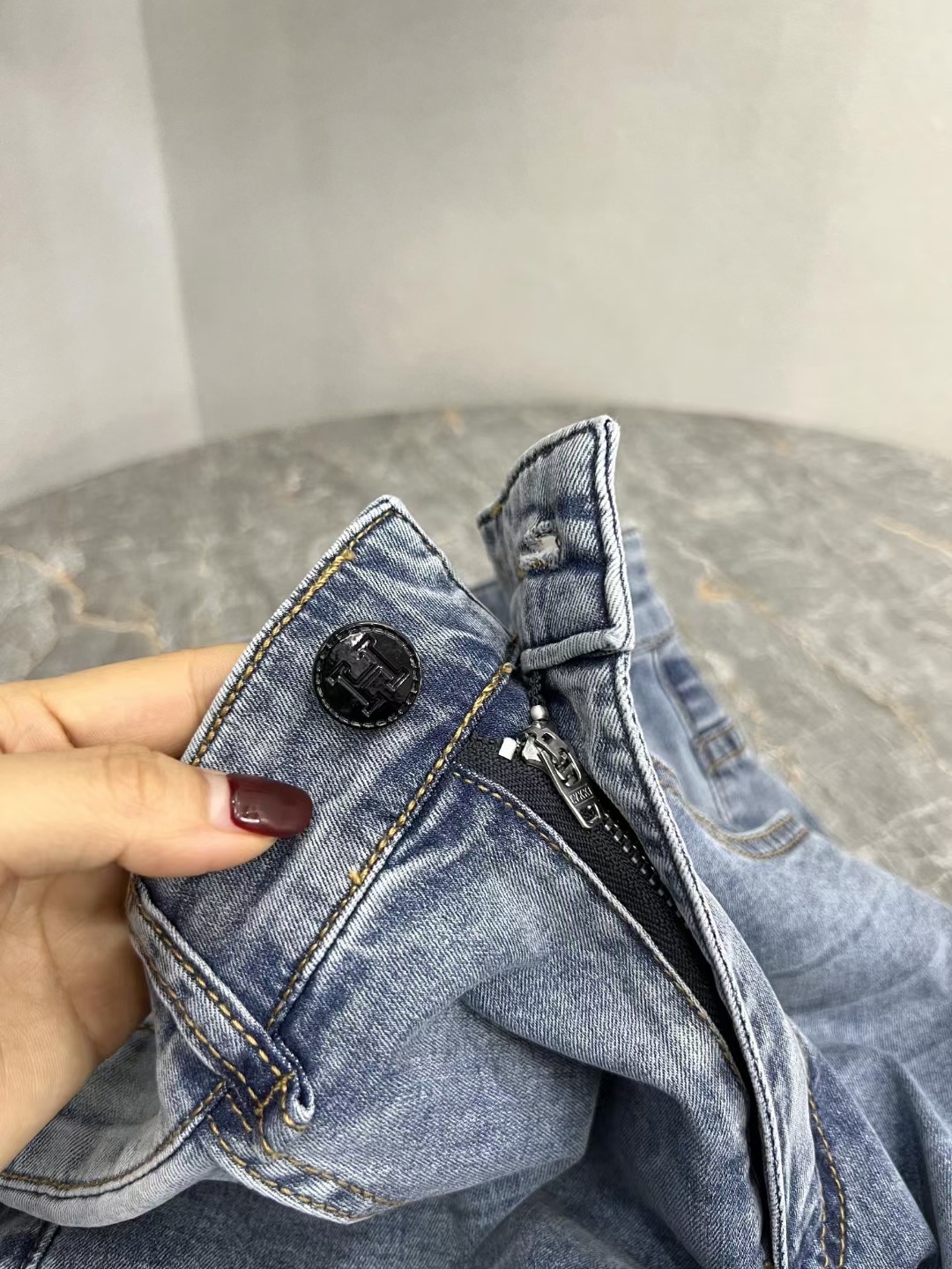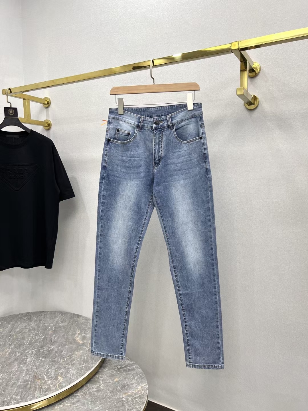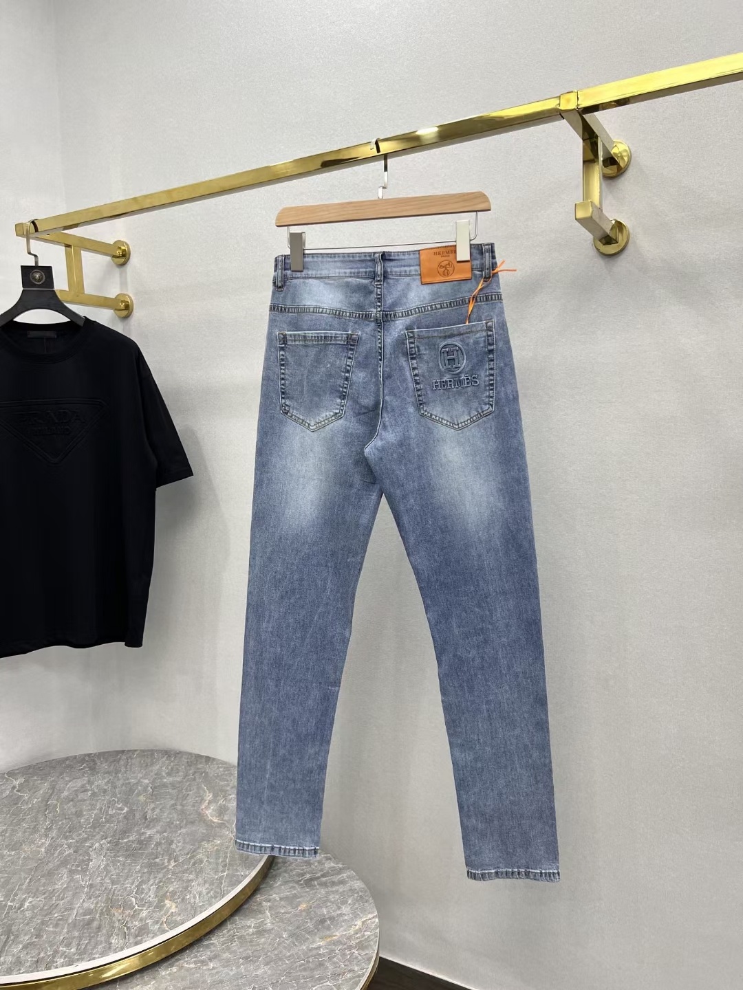 爱马* 男士高级局部磨白风格系列浅蓝色牛仔裤 #男装# #牛仔裤#