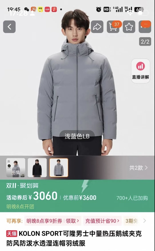 K0LON SPORT,男士中量热压防泼水鹅绒服。