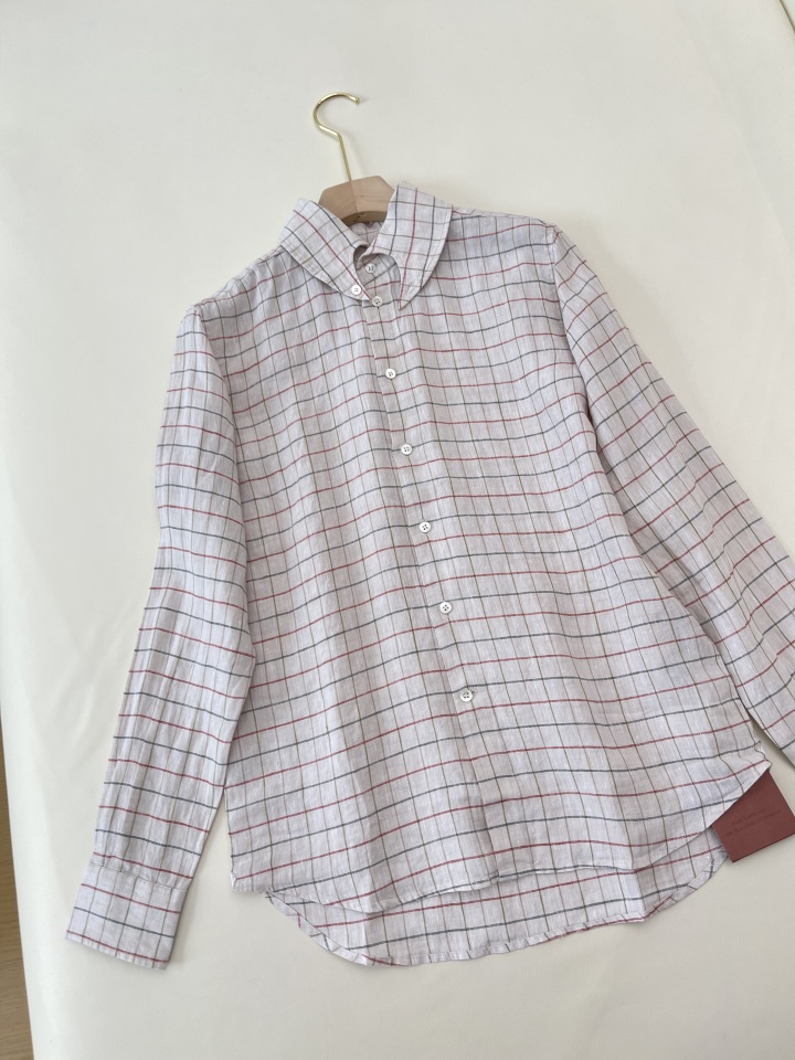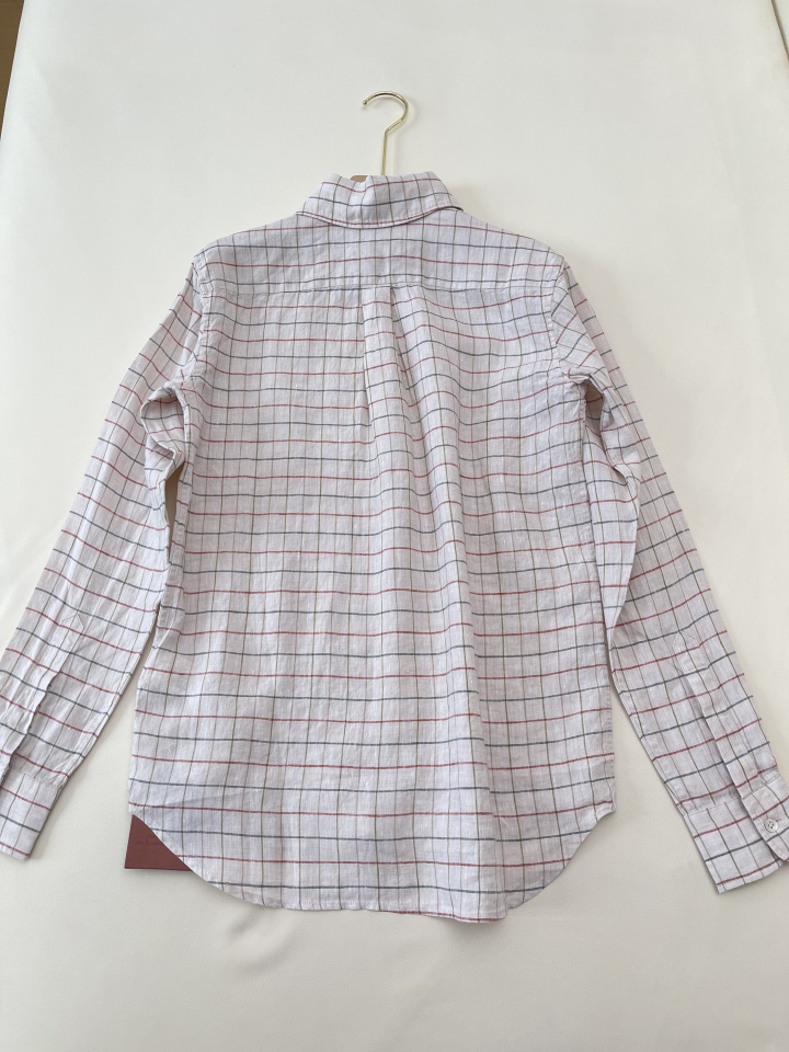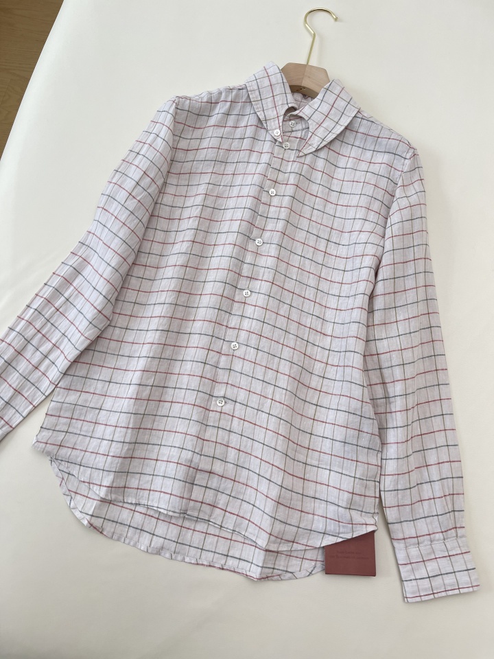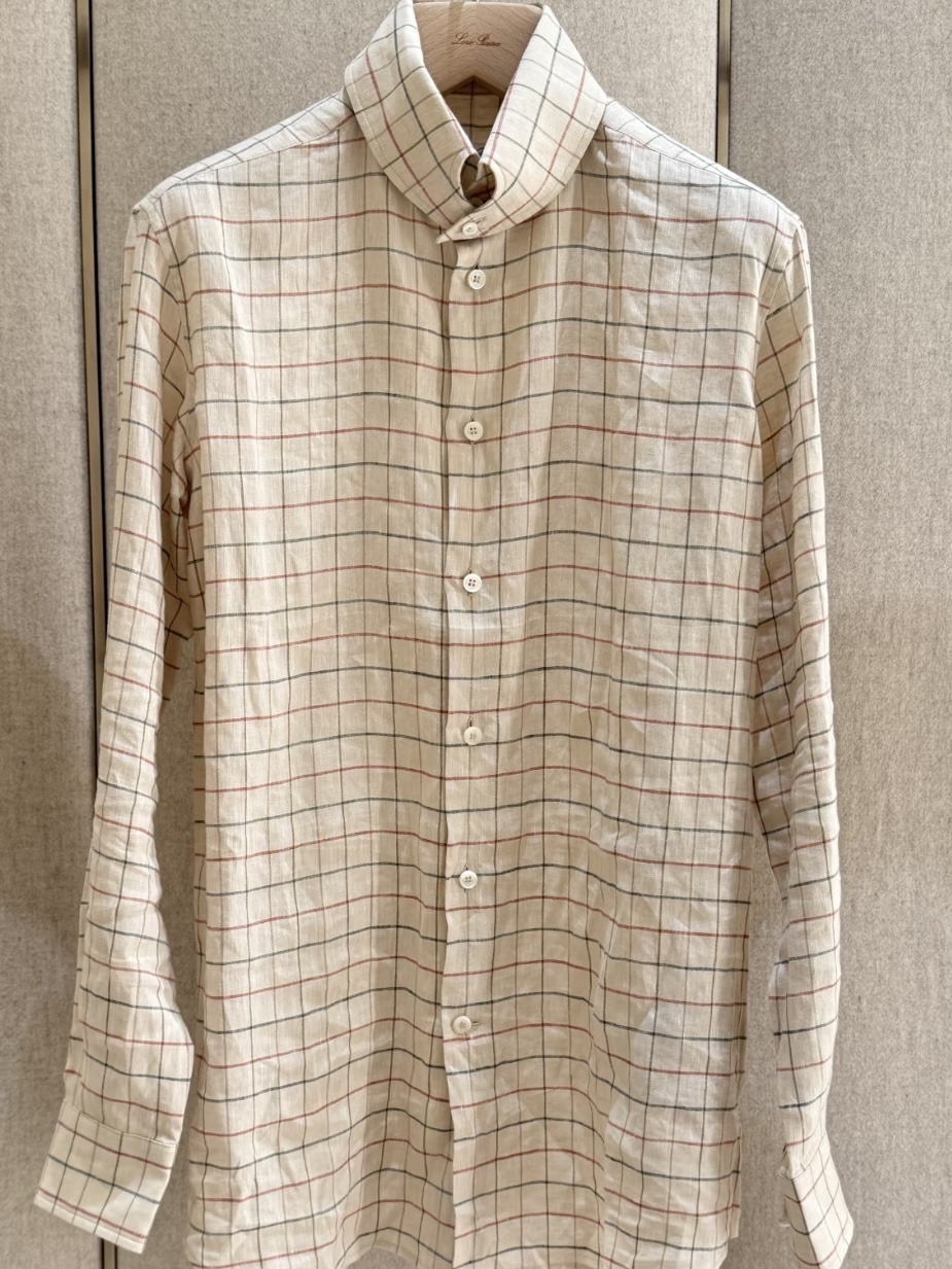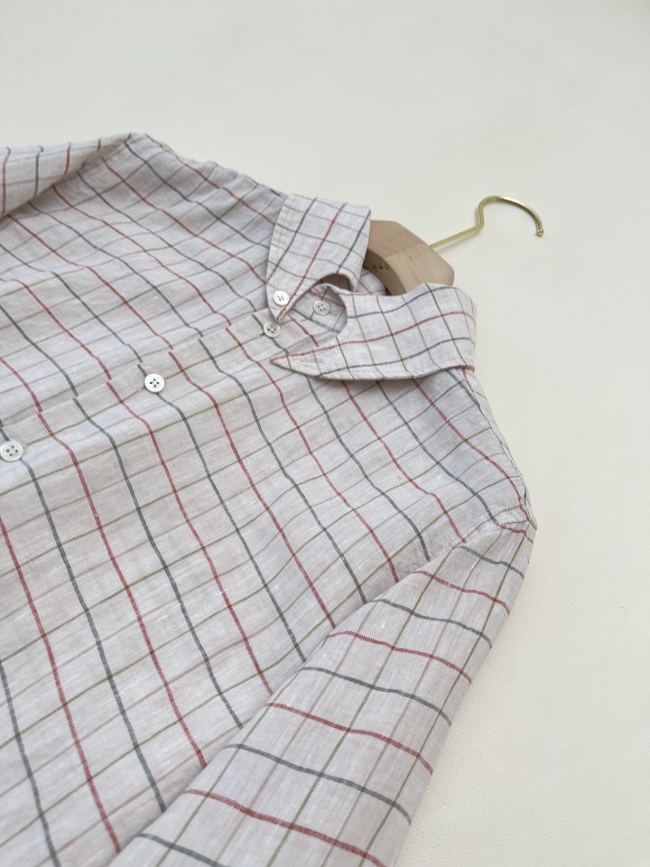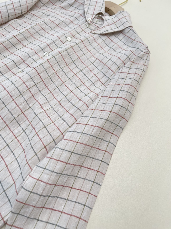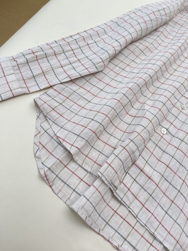 L.P舒适透气亚麻文艺格纹燕尾领衬衫休闲宽