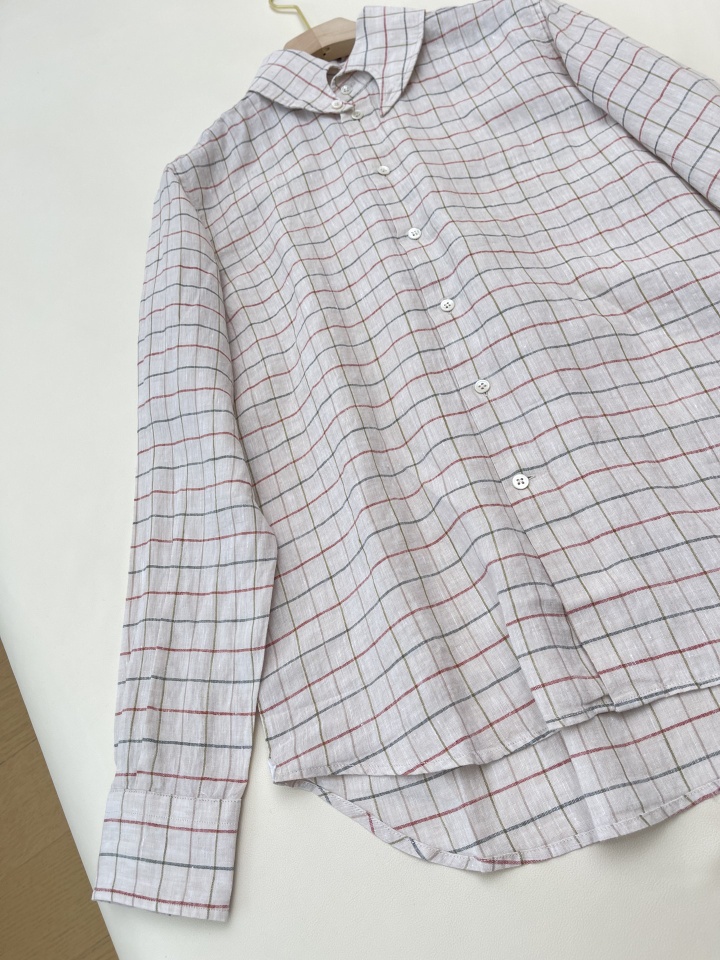 L.P舒适透气亚麻文艺格纹燕尾领衬衫休闲宽松上衣